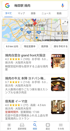 表示箇所を見てもわかる通り、このエリアは自然検索結果よりも上に位置しており、よりユーザーの目に留まるようになっています。(ちなみに一番上位の赤枠の焼肉白雲台は弊社が運営しているのです。)